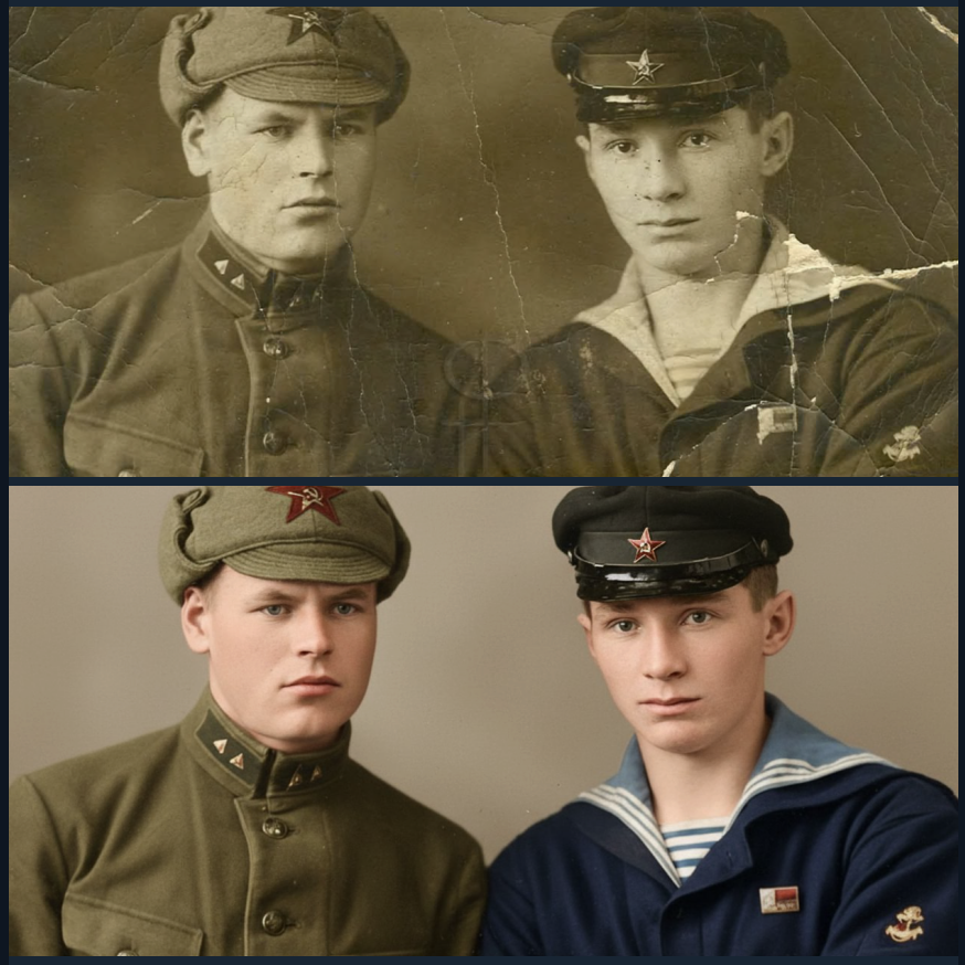 Пишем боту: На изображении старая фотография. Восстанови ее – убери трещины и потертости. Сделай ее цветной. Цвета должны быть максимально реалистичные